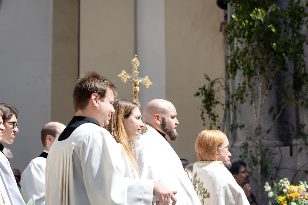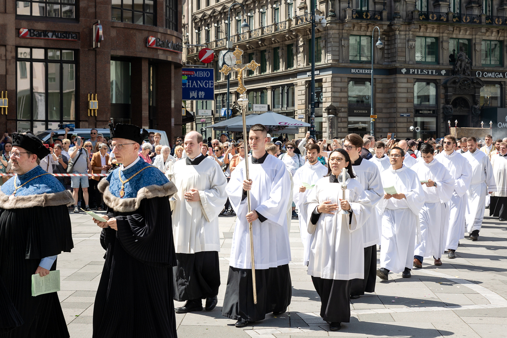 Zu Fronleichnam bringen wir Katholiken öffentlich unseren Glauben zum Ausdruck, dass Gott in Brot und Wein mitten unter ihnen ist. Als sichtbares Zeichen wird eine reich verzierte Monstranz mit einer geweihten Hostie in feierlicher Prozession durch die Straßen getragen.