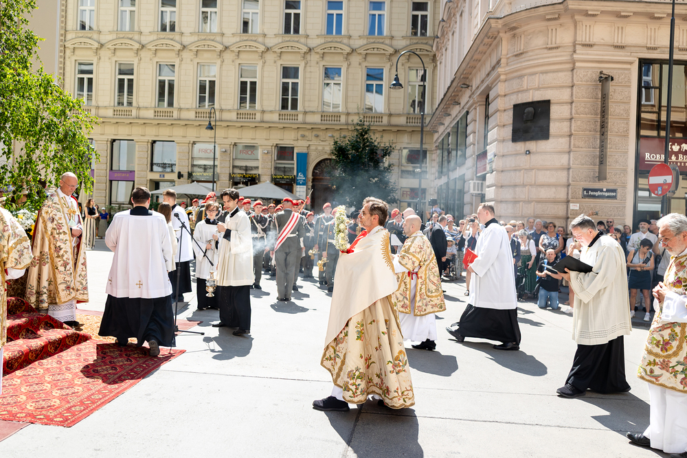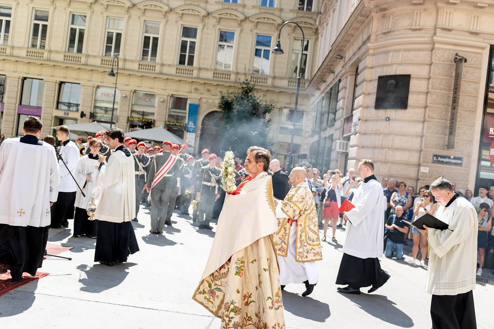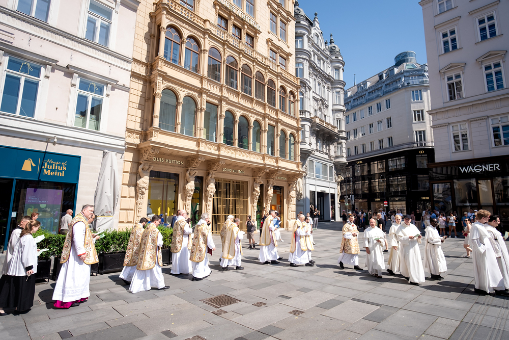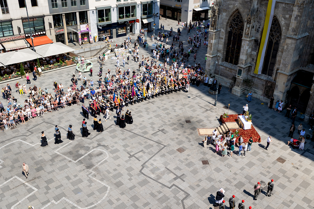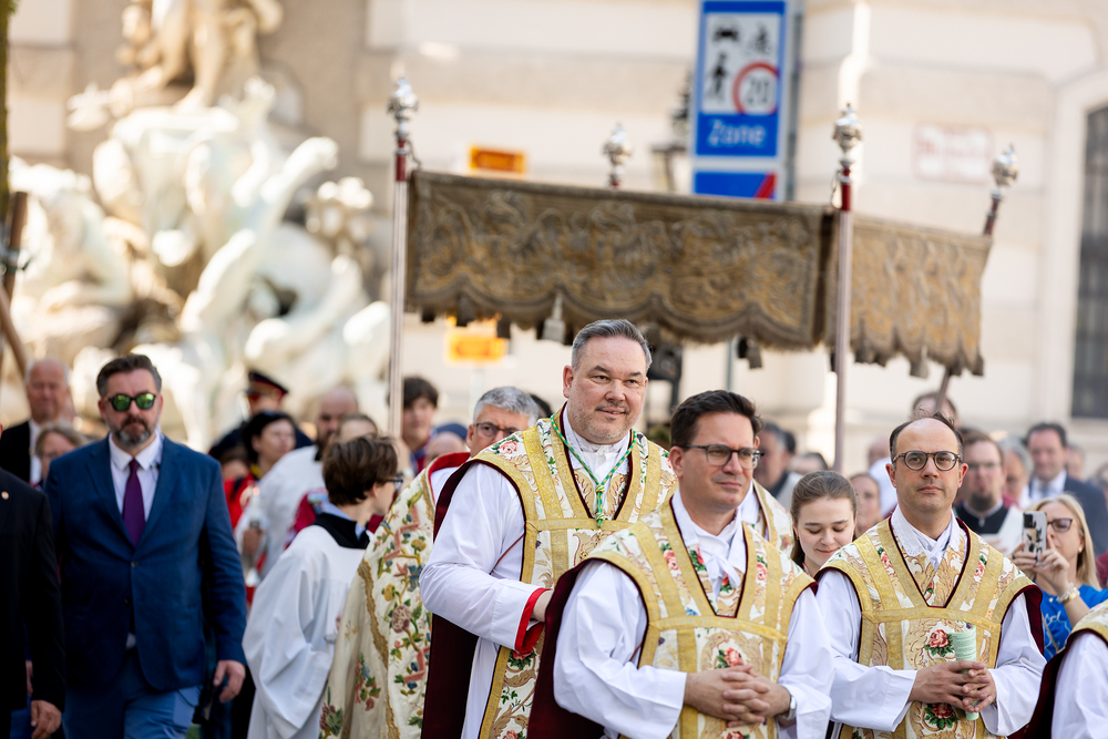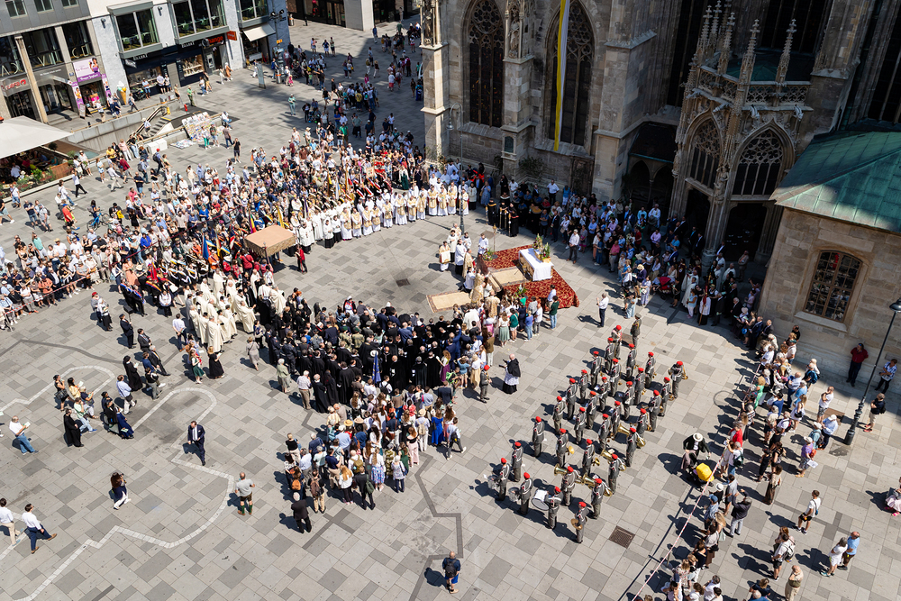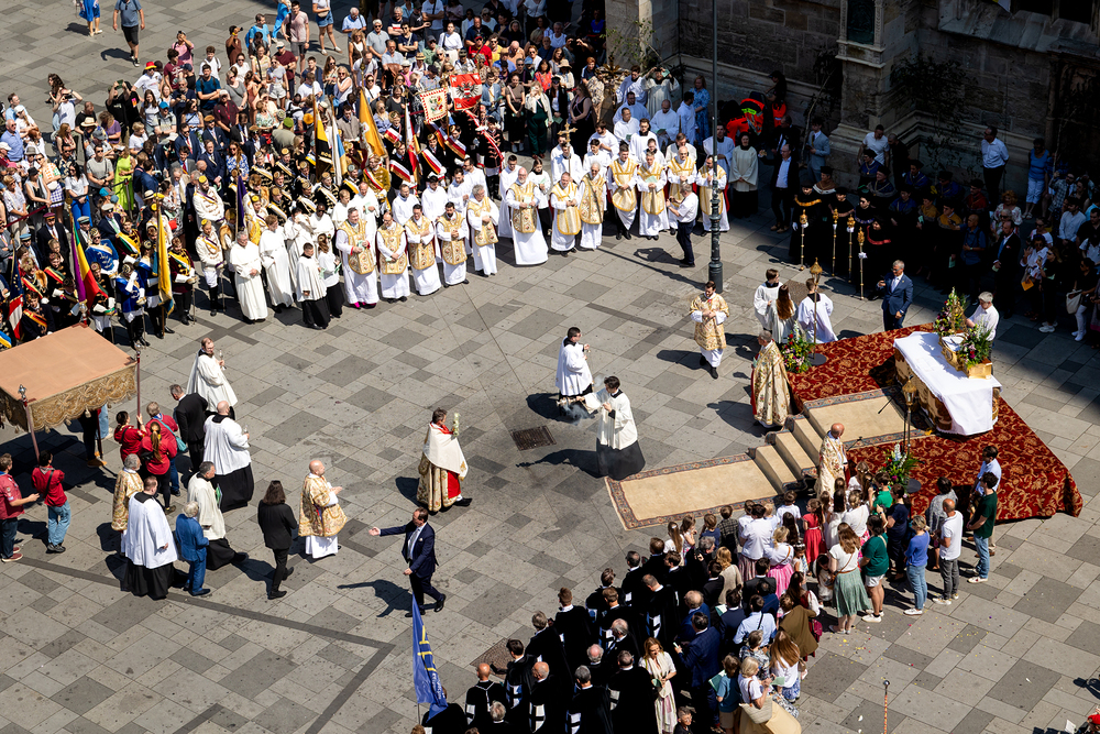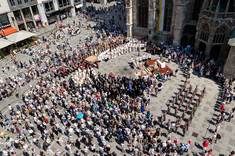 Josef Grünwidl betonte beim Stadtumzug anlässlich Fronleichnam die untrennbare Verbindung zwischen dem religiösen Feiertag und der christlichen Verantwortung, Gottes Schöpfung zu bewahren und eine „ökologische Umkehr“ angesichts der Klimakrise einzuleiten. Er dankte allen, die durch nachhaltiges Handeln und politischen Einsatz dazu beitragen, notwendige Maßnahmen zu ergreifen, um die dramatischen Folgen des Klimawandels abzuwenden. Die Fronleichnamsprozession, die vom Stephansdom ausging und Stationen am Michaelerplatz sowie am Graben bei der Peterskirche umfasste, zog erneut zahlreiche Gläubige und kirchliche Gruppierungen an. Auch politische Vertreter waren anwesend. Wir waren mit der Kamera dabei.