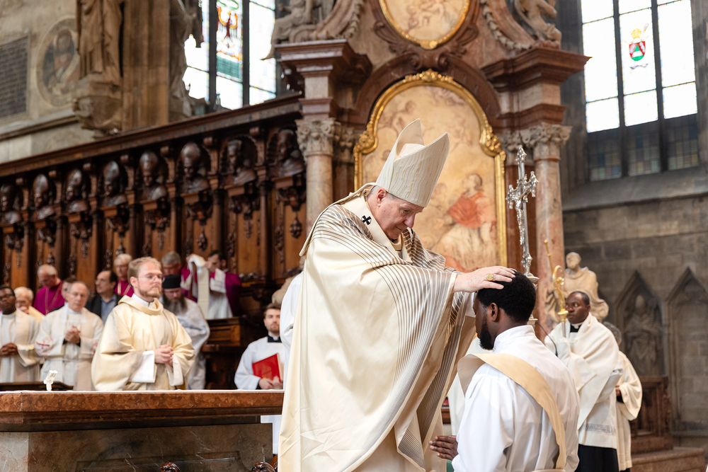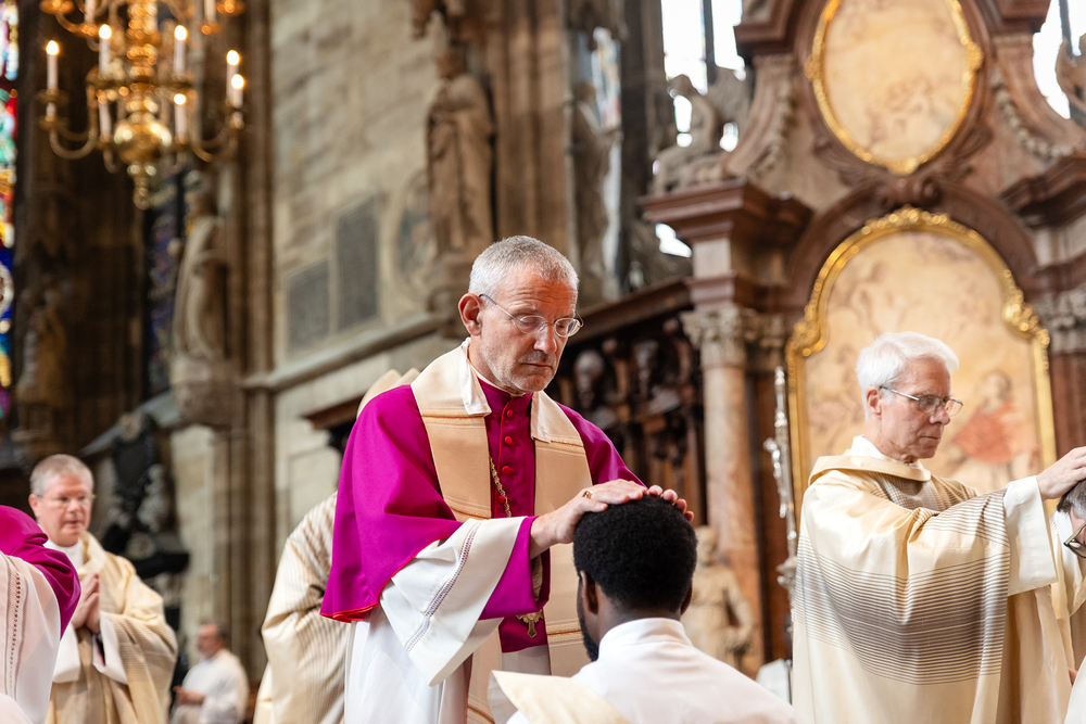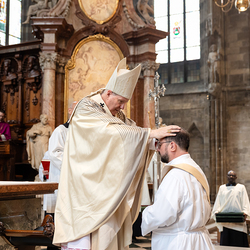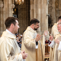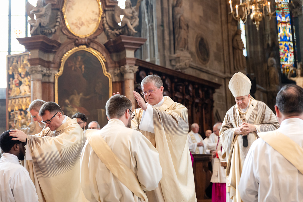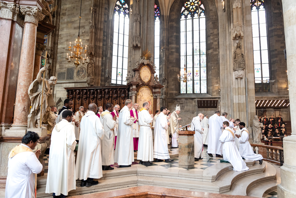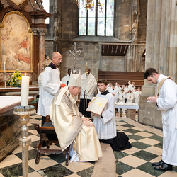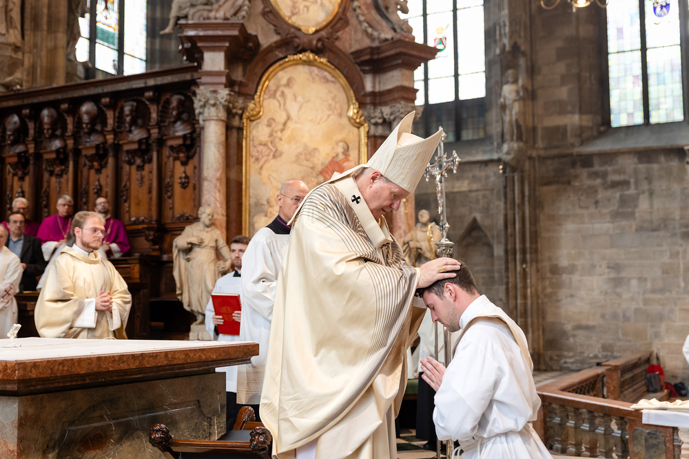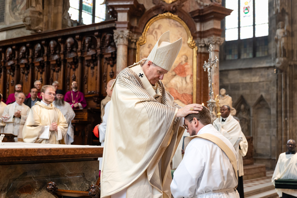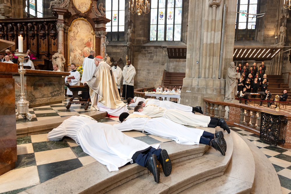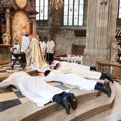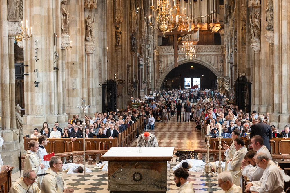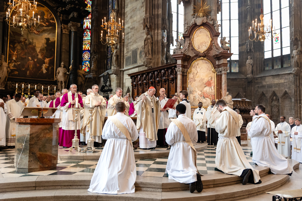 Der Wiener Erzbischof Kardinal Christoph Schönborn weiht Florian Damberger, Enrico Grube, Daniel Schmitt, Diakone aus dem Wiener Priesterseminar, sowie Michal Klucka und Chinedu Okafor, beide Salesianer Don Boscos, zu Priestern. Wir waren mit der Kamera dabei.