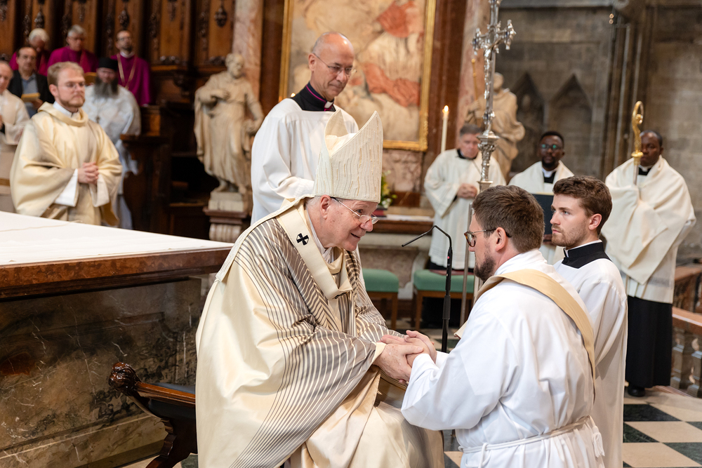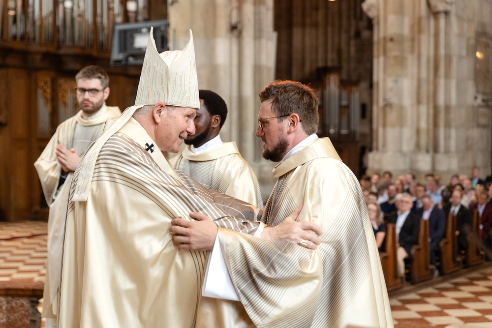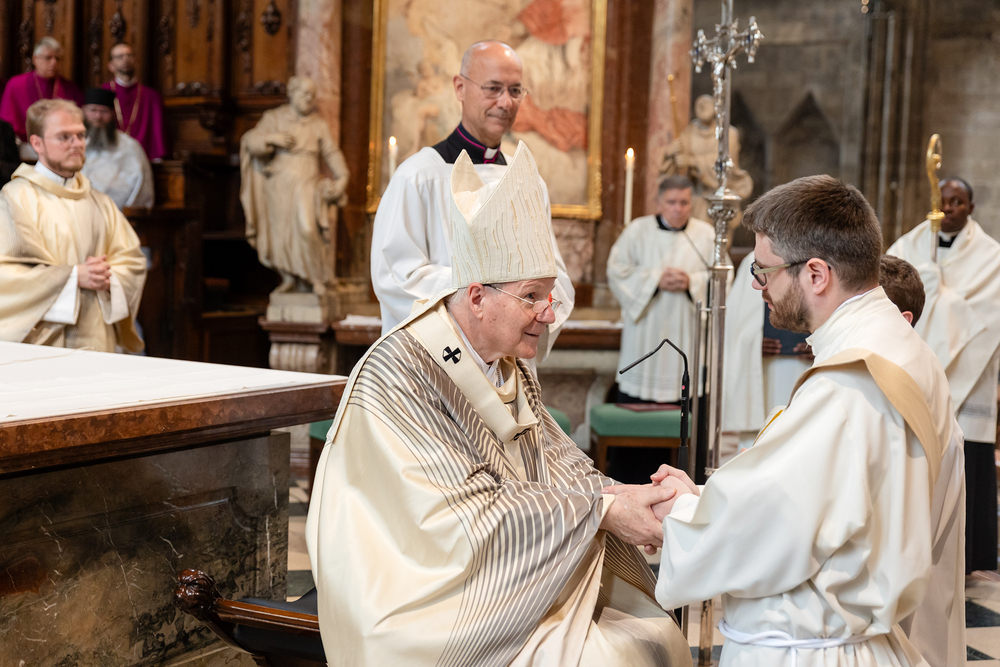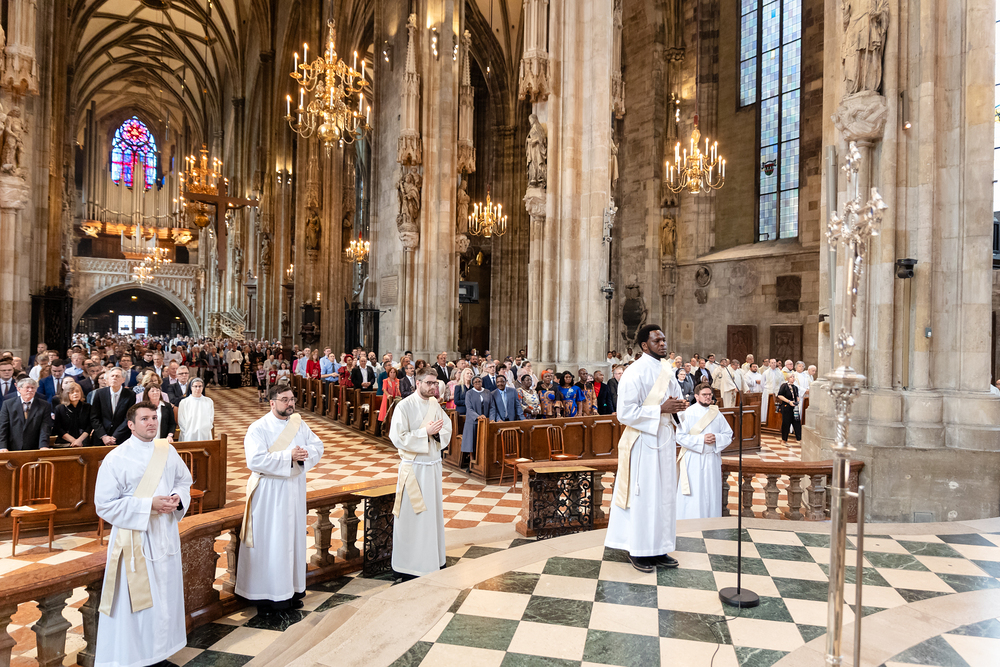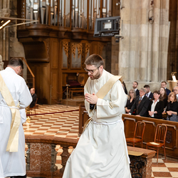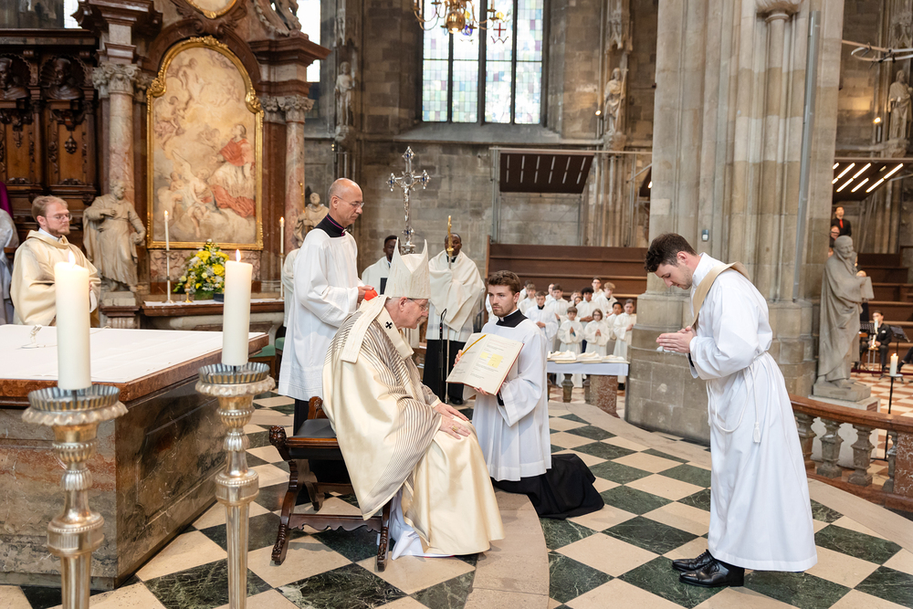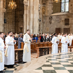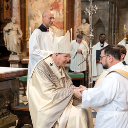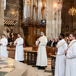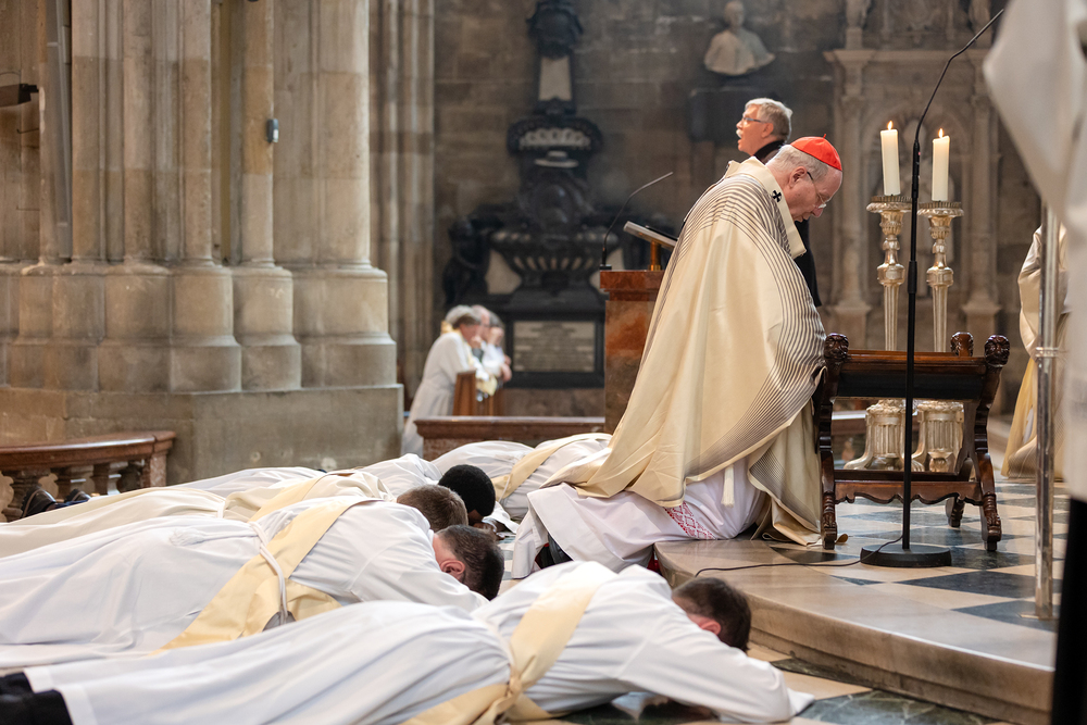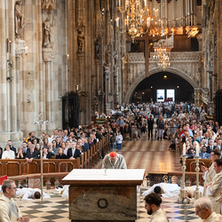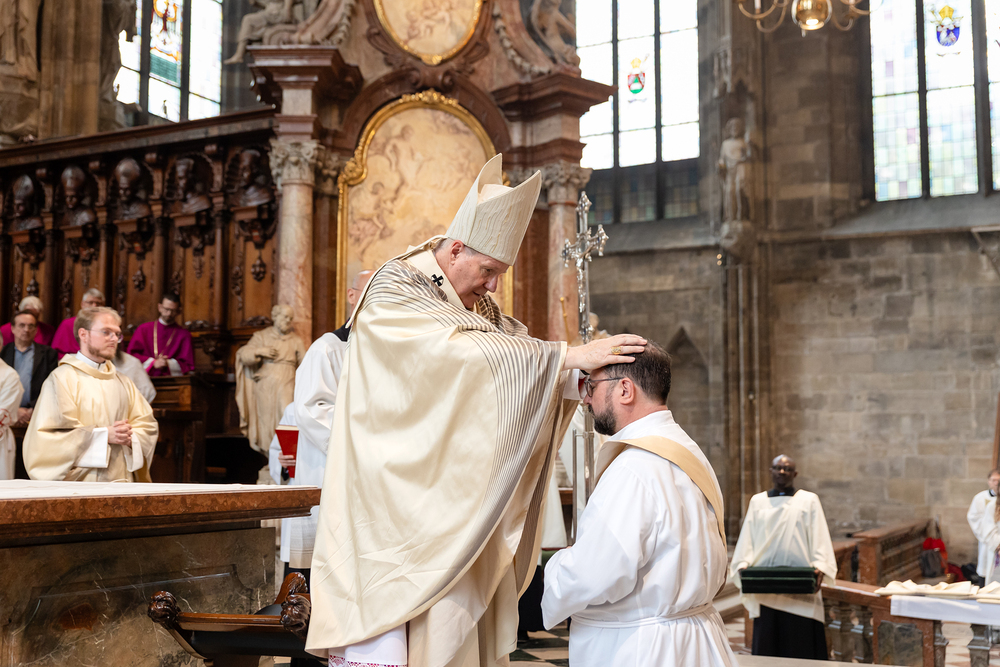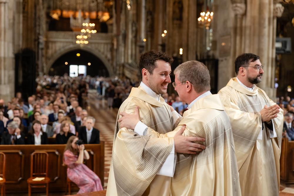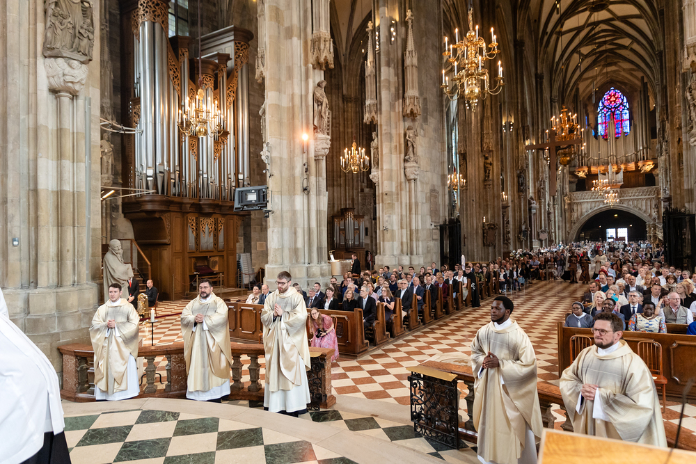 Der Wiener Erzbischof Kardinal Christoph Schönborn weiht Florian Damberger, Enrico Grube, Daniel Schmitt, Diakone aus dem Wiener Priesterseminar, sowie Michal Klucka und Chinedu Okafor, beide Salesianer Don Boscos, zu Priestern. Wir waren mit der Kamera dabei.
