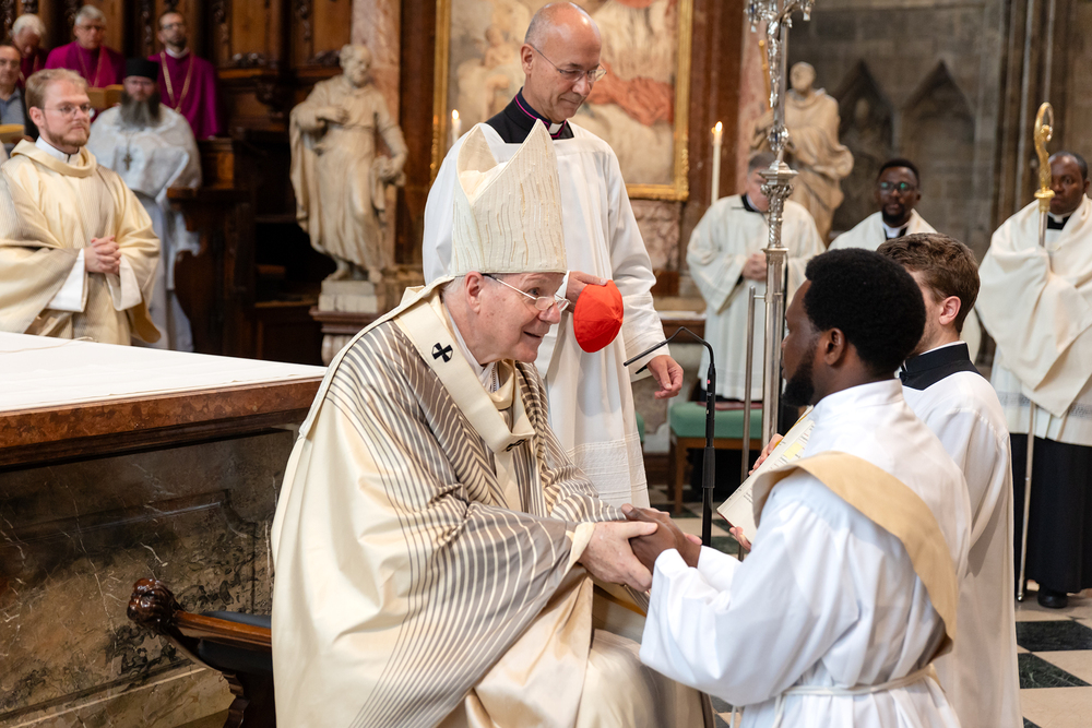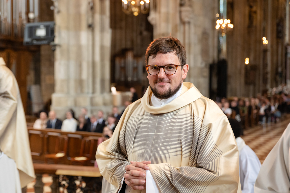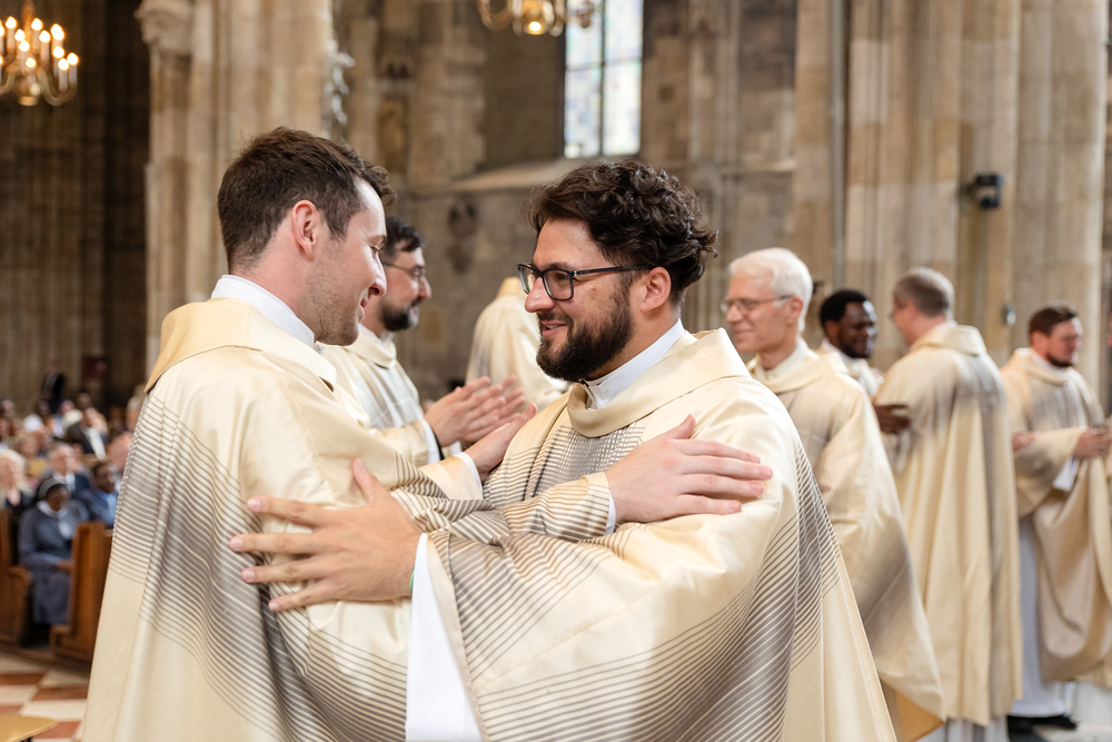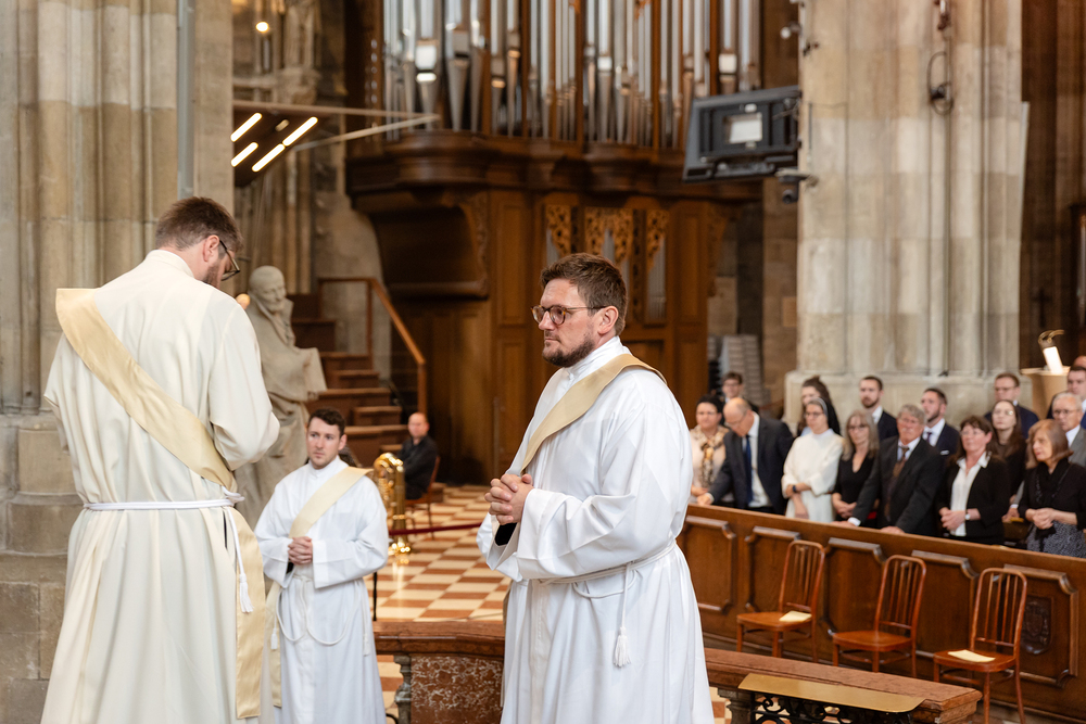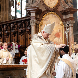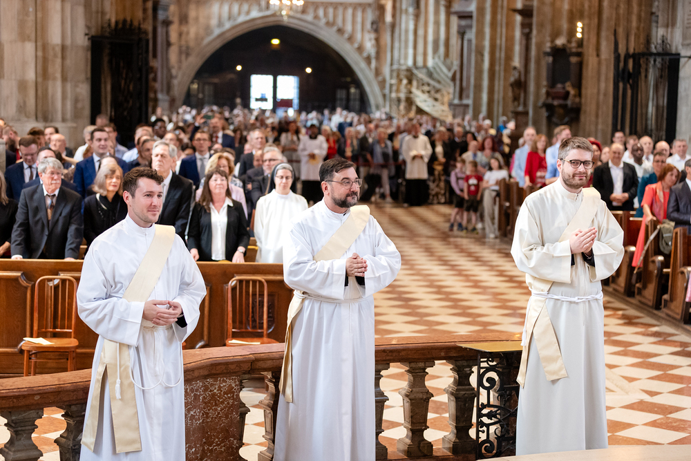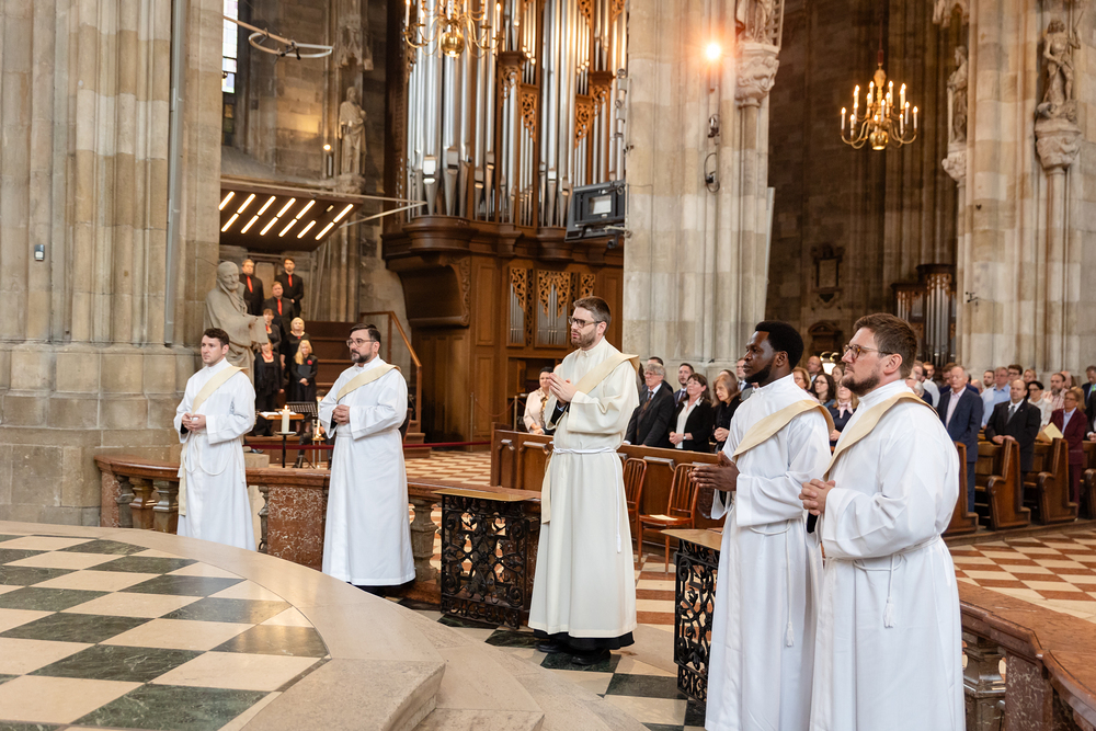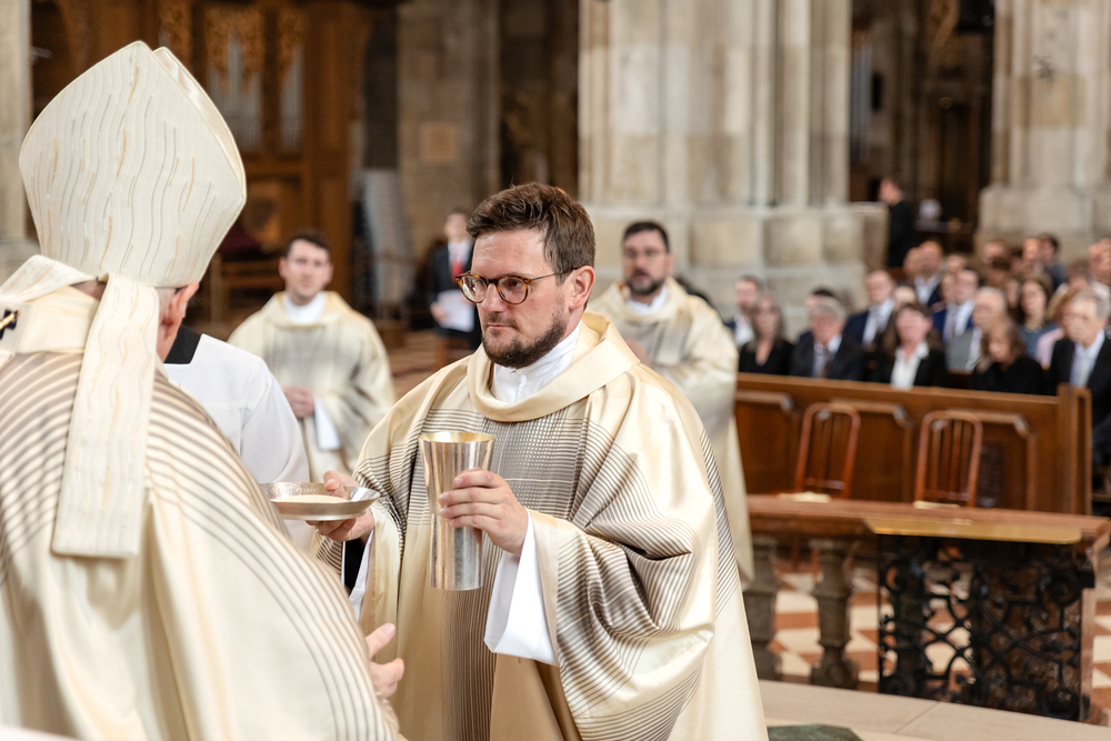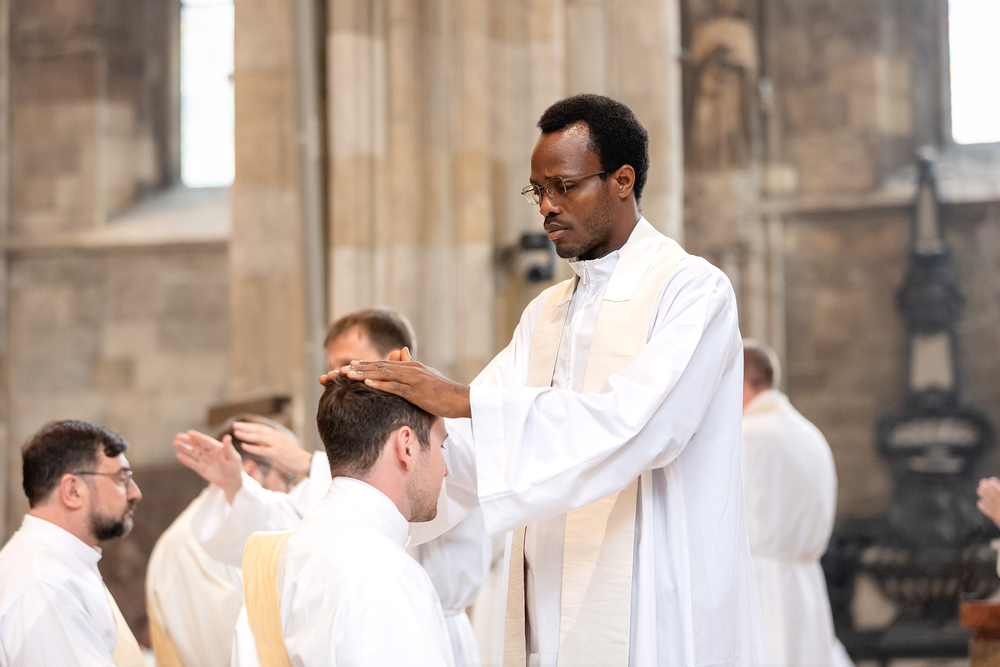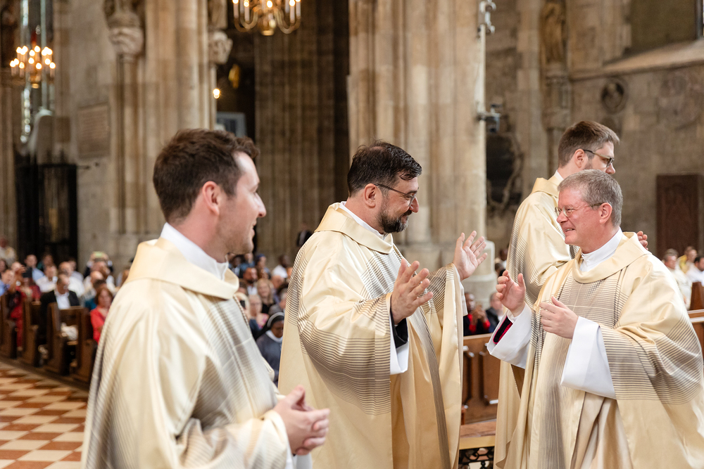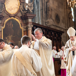 Der Wiener Erzbischof Kardinal Christoph Schönborn weiht Florian Damberger, Enrico Grube, Daniel Schmitt, Diakone aus dem Wiener Priesterseminar, sowie Michal Klucka und Chinedu Okafor, beide Salesianer Don Boscos, zu Priestern. Wir waren mit der Kamera dabei.
